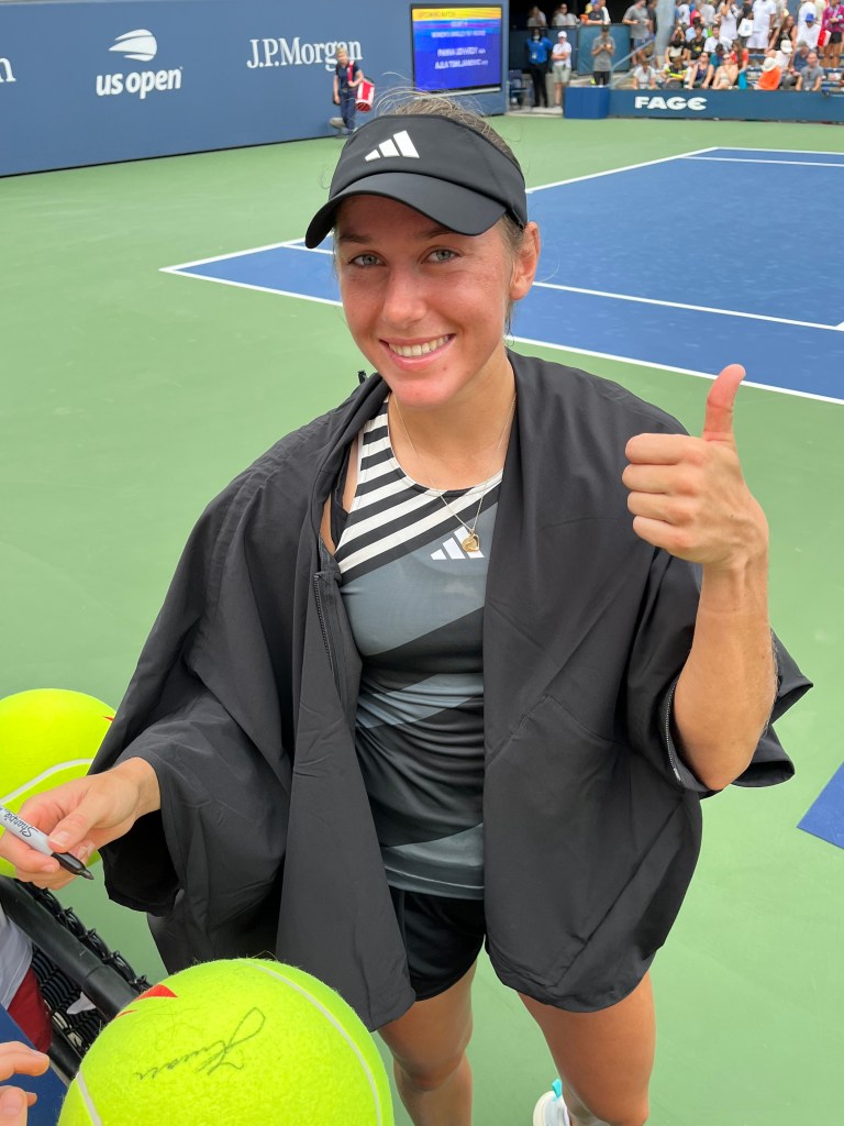 FLUSHING, NY–After two three-set qualifying wins over the weekend, Slovenia’s Kaja Juvan rolled through her first round main draw match at the US Open on Monday like a beast, ousting favorite and 29 seed Elisabetto Cocciaretto, 6-2, 7-5. She had a little help from the experience of the mayhem of qualifying on Arthur Ashe Kids’ Day.